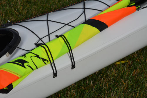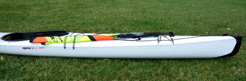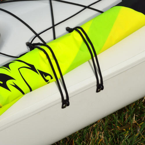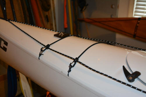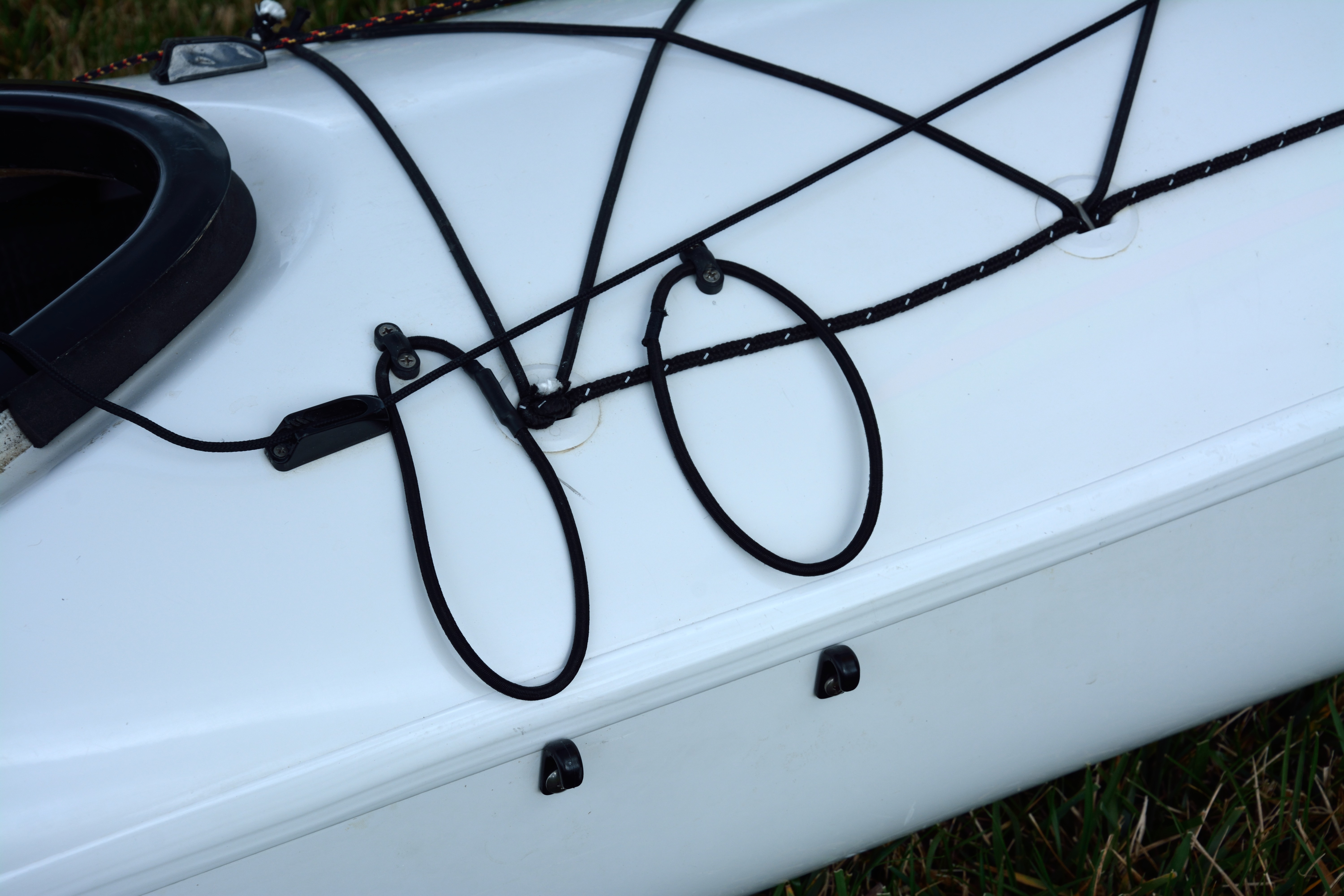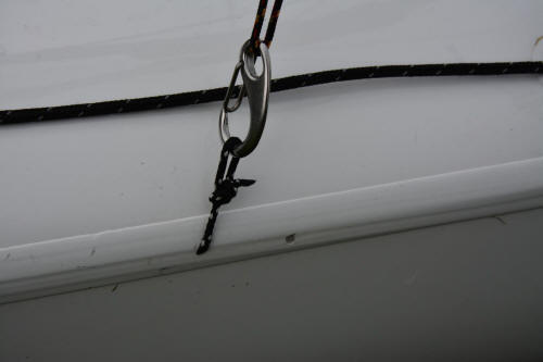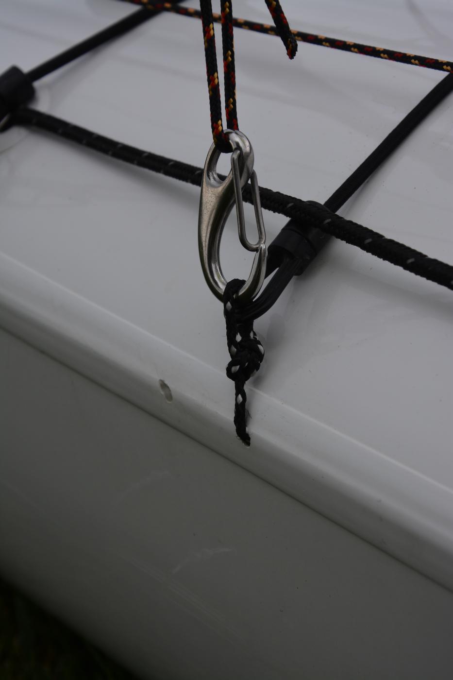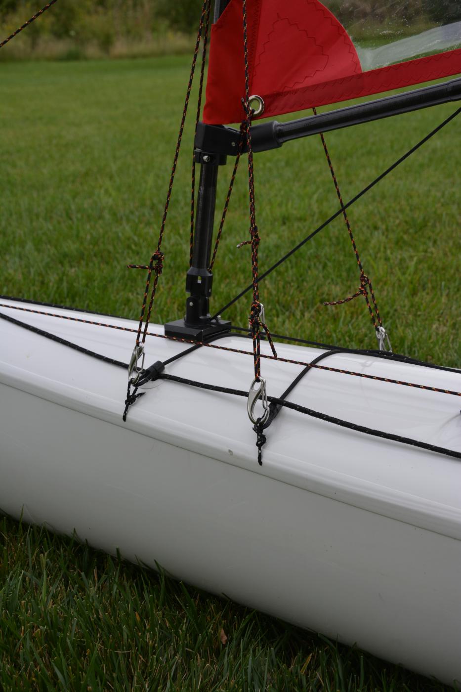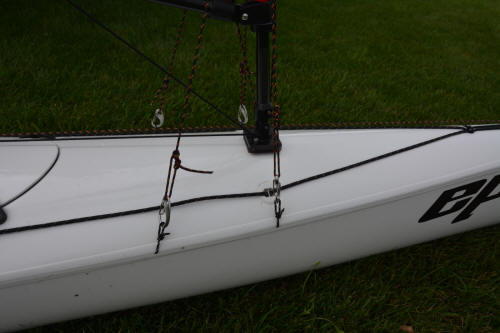 ![]() Here you can see the mast stay line anchor points on the outside of the boat held in place with shock cords. The shock cords are handy just like the stock shock cords on the boat. The anchor points are made out of polyester covered dyneema cord. |
