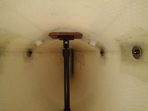 ![]() Here is the reinforcement block epoxied to the deck of the boat, with the Falcon Sail patent pending mast compression strut in place. It swings out of the way in seconds for easy packing. It can also be completely removed and replaced in seconds if necessary. You can also see the stainless stay line anchor points imbedded in thickened epoxy over fiberglass reinforcement. |